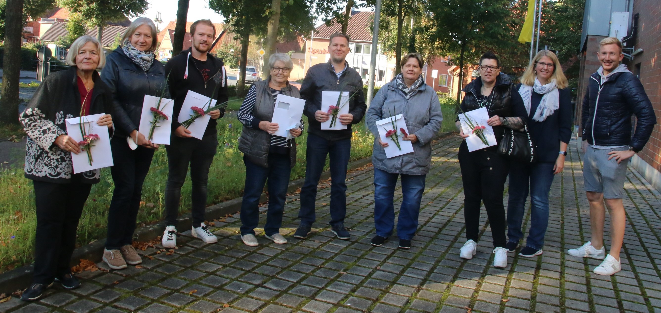 "Die Heimat im Herzen" war der Titel unseres Gewinnspiels im September. Anfang Oktober haben wir die Gewinner und Gewinnerinnen gezogen und sie haben dann einen Umschlag erhalten in welchem sich der Gewinn befand. Die Ballonfahrt über die Gemeinde gewonnen hat Marlies Heussmann (2.v.l.). Über Gutscheine im Wert von je 50 Euro für das Restaurant Pfeffermühle, das Restaurant Waidmannsheil, die Weserlust, Simple Burger, Wolfcenter und Odysseus freuen sich unsere Gewinner und Gewinnerinnen Lisa Frommberger, Nico Jelonek, Sönke Ruge (der von seiner Mutter vertreten wurde), Thomas Rolfsmeyer, Heike Ristau und Monika Kurth. Organisiert wurde das Gewinnspiel von den beiden Mitgliedern des Kandidatenteams Karin Mohr und Michael Schwertner (von links nach rechts).