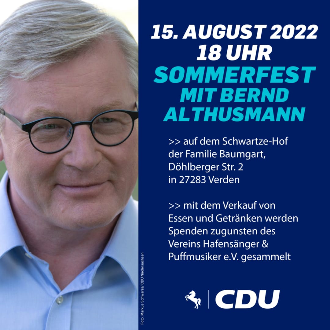 unser Sommerfest steht kurz bevor, zu dem wir Sie/Euch herzlich einladen. Das Fest findet bei der Familie Baumgart auf dem wunderschönen Schwartze-Hof statt. Gemeinsam mit dem Stadtverband Verden dürfen wir als Ehrengast Bernd Althusmann begrüßen. Wir freuen uns auf viele Besucherinnen und Besucher. Es gibt Essen und Getränke.