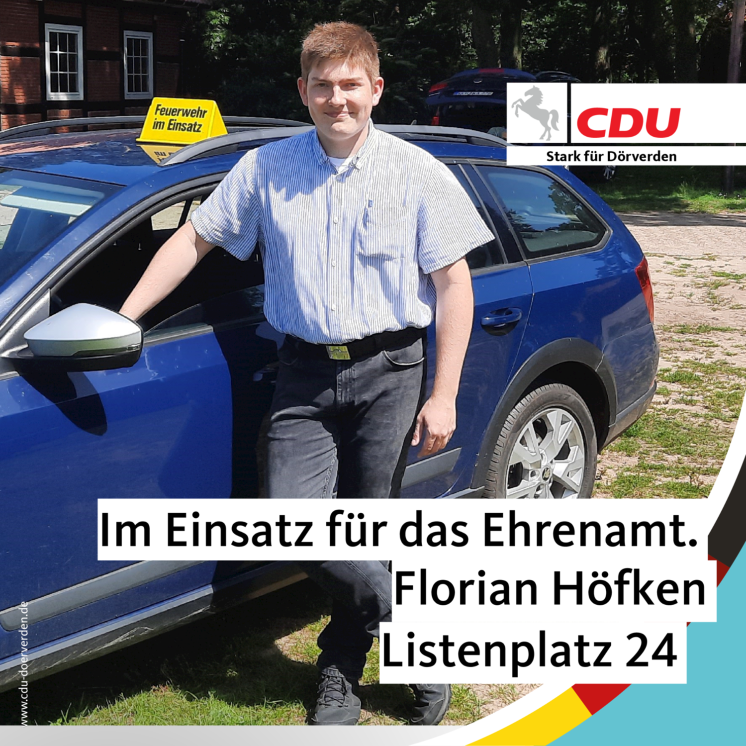 Unser jüngester Kandidat Florian Höfken ist 19 Jahre alt und lebt in Westen. Er ist Auszubildender zum Elekroniker für Betriebstechnik. Neben der Politik, dem THW und der Feuerwehr ist Florians Hobby Motorradfahren.