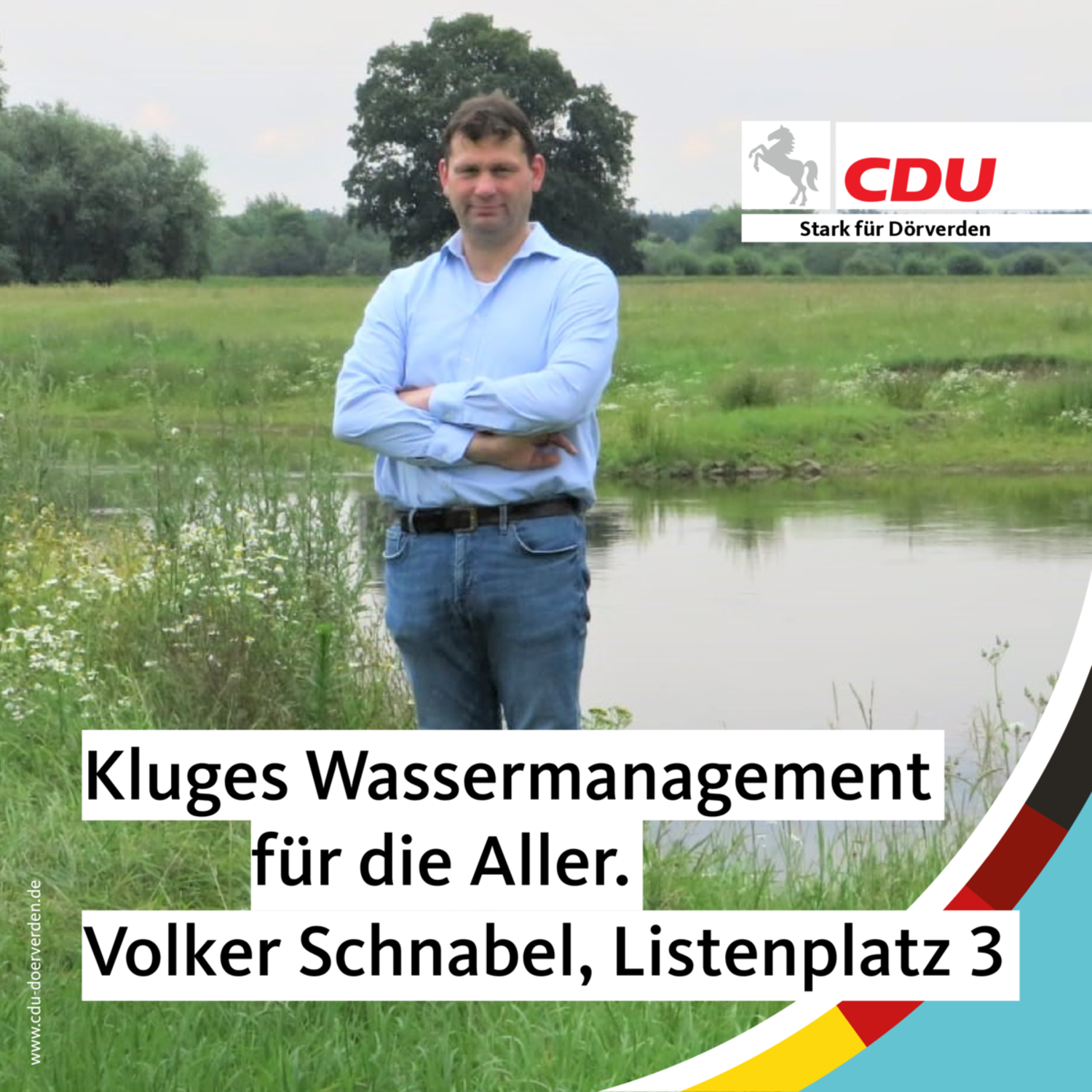 Ich möchte mich dafür einsetzten, dass die Aller auch in Zukunft für alle Bewohner der Gemeinde Dörverden eine Bereicherung ihrer Heimat darstellt. Die Aller soll Entwicklungsmöglichkeiten für die Freizeitgestaltung bieten und für die Landwirtschaft sollen Möglichkeiten erarbeitet werden wie in Zukunft das Wasser der Aller genutzt werden kann. Dies funktioniert nur mit einem „ klugen Wassermanagement“ welches zusammen mit allen Beteiligten entwickelt werden muss. Nur dadurch wird es auf ein breites Fundament gestellt und hat für die Zukunft bestand. Das Land und der Bund haben Projekte ins Leben gerufen die auch durch Beschlüsse des Kreistages unterstützt werden. Hier gilt es für uns als Gemeinderat die Schwerpunkte zu setzten die für uns als Bürgerinnen und Bürger der Gemeinde Dörverden wichtig sind. Dieses möchte ich in den nächsten fünf Jahren für Sie mit entwickeln und voranbringen. Dafür bitte ich am 12. September um Ihre Unterstützung.